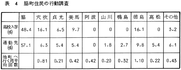 商店街で買物行為がなされる場合、単に買物をするために出かけることよりも通学、通勤先などで用を済せる場合も多い。表4は脇町住民の生活圏の調査であるが買物行為にも大きな影響を与えると思われるので、ここで調査してみることとする。