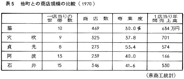 以上、地域的な変化を見てきたが、現在のところ新しく店舗が建設されている所は道路にそって分散的であって商店核としての機能を果すまでには至っていない。したがって既存の脇町商店街に対する脅威となっていないが、広い道路(駐車場をもつことも可)の周辺に急速に形成される商店は、特に拝原地区などは商店核となる可能性も強く、東部にも小型の核が出現しそうな情勢である。脇町の商店街は中小企業が多いことはすでに述べたが、ここで地域的変化による商店街出現の動きと共に、商品販売の上でスーパーストア(Super