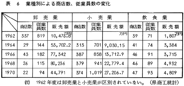 近年商店の大型化、専問化が地方商店街でも目立っており、脇町でも萌芽のきざしが見えつつはある。また業種別商店数では卸売業、小売業の商店数が減少し、飲食業はここ1、2年増加している。しかし販売額から見た場合どうであろうか。全国的には小売消費に占めるシェアから見ると、百貨店が約10%、セルフサービス店が約6%となり、その他は生協と呼ばれる消費機関の約1%を加えても2割に及ばず、小規模店の集まった商店街は小売消費に占めるシェアが高いということが出来る。脇町の場合にも、かっての卸売業が販売額でも相当な比重を持っていたが、近年小売業のそれが急速に伸びており、同様の結果となっている。