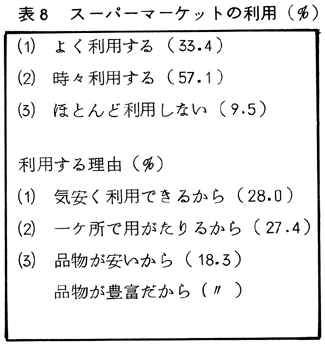 market)―食料品主体の進出等も考察の必要があろう。商店経営において人件費を10%節約すれば価格で20〜30%安に出来るといわれているが、スーパー店は人件費をできるだけ節減し、豊富な商品を出来るだけ安価に提供しようとするためにアメリカで出現したものである。老舗やデパートが高級品を扱うのに対して、主として最寄品を扱うところに特色があろう。脇町でもスーパー店はよく利用されており(表8)、その理由として庶民性が第1にあげられている。これに対して商店街ではディスカウント方式を採用したり、大安売を行ったり、土曜市、謝恩奉仕、季節大売出しなどの宣伝で対抗している現状である。一部の人たちの意見によれば、現在スーパーの商況は反省期に入ったとも伝えられるが、それにしても店内を見たところ主婦や学生などを中心に相変らず活況を呈している。現在脇町のスーパー店では強引なロス・リーダー商法(Loss