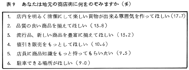 最後に地元の住民は脇町商店街に何を望んでいるのだろうか。アンケートによれば、楽しいムードをあげる者が一番多かったが、これは1商店の努力では解決できる問題でなく、商店核の大小(商圏)を決定する要因であるだけにブラブラ歩きの出来る商店街としての創意と工夫が望まれよう。最近の国民生活白書でも消費の動きとして1