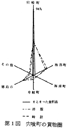まず食料品では、その殆んどが宍喰町内で行なわれており、洋服は約半分は宍喰町であるが、第2位は海部町、第3位が徳島市となっている。また時計については、これも洋服とまったく同じで第1位宍喰町、第2位海部町、第3位徳島市となっている。上にあげた指標以外では、例えば下着類、和服、家具電気器具などにおいては、食料品の場合と殆んど同じ傾向を示している。