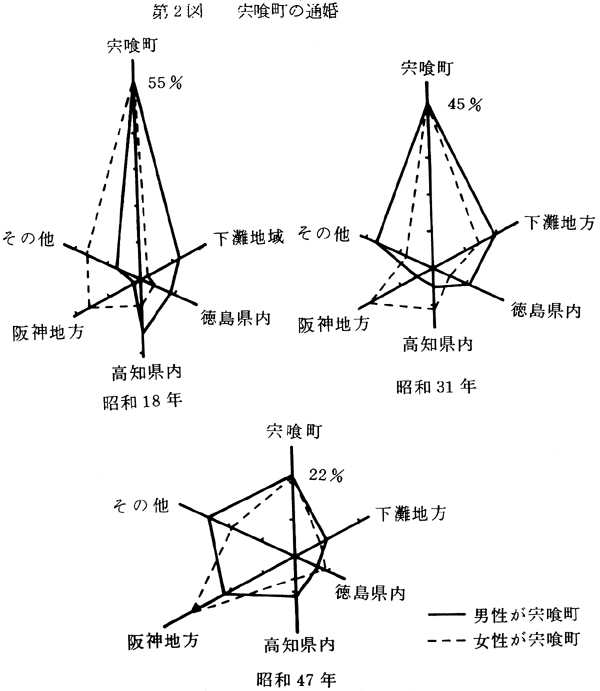 宍喰町での昭和18年、31年、47年についての状態をみると第2図のようになる。ここで、実線は男性が宍喰町で女性がどこかということを示し、また破線は女性が宍喰町で男性がどこかということを示したものである。この図からわかることは、阪神との結びつきの増加の著しいことである。特に宍喰町出身の女性が阪神地方へ嫁ぐ場合が増加している。男性が宍喰町の出身者の場合は、阪神地方の割合の増加もさることながら、その他の地域の急増が顕著である。つぎに宍喰町同士というのが、停滞から減少傾向にあることが目につく。さらに県内各地域との結びつきがあまり強くないことも目につく。以上のような阪神地方との結びつきの強いことは、いわゆる過疎といわれるような人口現象と強い関係があると想像される。すなわち人口の阪神地方への流出がその原因であろうと思われる。