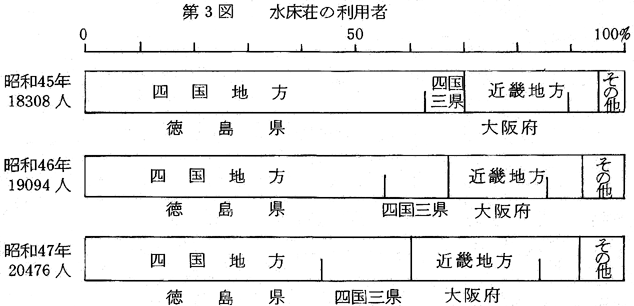 域内への人の移動状況を知るために宍喰町内にある国民宿舎水床荘の利用状況をその資料としてとりあげる。昭和45年、46年、47年の各年の利用者についてみてみると、第3図のとおりである。徳島県内在住者の利用が最も多く、ついで大阪在住者の利用が多くなっている。また四国全体の割合や徳島県内の割合が減少しているが、徳島県以外の三県の割合が増加していることと、大阪を中心とした近畿地方の増加が顕著になっている。