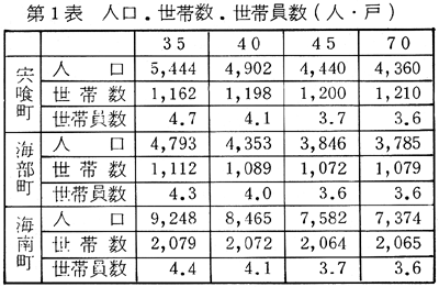 宍喰町においては、昭和35年から昭和47年までの12年間に5444人から4360人へと1084人の減少となっている。海部町、海南町ともに減少しており、三町全体の減少率は約20%になっている。いわゆる人口流出の大きい地域であるといえる。世帯数については、宍喰町については若干増加しているが、他の二町においては減少している。また一世帯あたりの家族員数は、宍喰町では4.7人から3.6人へ、対象にした地域全体では4.5人から3.6人へと減少している。この3.6人という数は、都市部と殆ど同じで、都市周辺部よりは少なくなっている。これは人口の社会的移動の大きいことを予想させるものである。