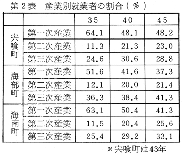 次に産業構造をみてみると(第2表)、宍喰町における産業別就業者の割合は、第1次産業が48.2%、第2次産業が23.0%、第3次産業が28.8%となっており、やはり第1次産業が中心であることがわかる。また他の二町も宍喰町とあまり大きい差異はないが、海部町では第3次産業が41.3%と一番高い割合となっている。これは同町奥浦の商店街の影響が出ているものと思われる。次に時系列的に変化をみてみると、人口減少による就業者総数の減少が認められ、また各産業別にはあまり大きい変化は認められないが、強いてあげれば、第1次産業の減少と第2次・第3次産業のごくわずかではあるが増加が認められる。これらの現象はいわゆる過疎地域にみられる一般的現象のようである。