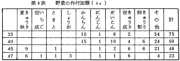 第一次産業が中心の産業構造となっているが、その中心はやはり農業である。宍喰町の農業の規模は、1戸あたりの耕地面積は0.7haで、0.7haまでの農家が全体の67.8%を占め、規模は小さい。宍喰町の297haの作付面積のうちで、75%は米、13.7%が果樹7.8%は野菜となっているが、これを産出額でみると、総額の54%(約1.3億円)を野菜があげている(第3表)。野菜の中では、第4表にみられるようにキュウリが中心となっている。結局、宍喰町の農業は野菜、特にキュウリを中心としたものであるといえる。海部町 海南町においても、おおよそ同じような傾向がみられるようである。