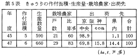 ここでは農産物、水産物、そして日常品の移動をとりあげる。まず農産物についてみてみる。宍喰町およびこの地域を代表する農産物は第4表にみられるようにキュウリである。促成キュウリは宍喰町、海部郡、海南町の三町で産地としての指定を受けているが、宍喰町がその中心になっている。宍喰町においては、昭和47年8月現在、29戸の農家が6haから660tを生産しており、すべて100万円以上の収入をあげている。前にも触れたように、宍喰町においてこの促成キュウリの栽培面積や栽培戸数は少ないけれど、産出額においては、他の作物にくらべて優位にある。このキュウリはすべて農協、県青果連を通し指定消費地である京阪神市場へ約90%を出荷し10%が県内向けとなっている。また指定消費地域では82%が中央でその他は18%となっている。このことから、京阪神への輸送園芸農業地域であるとおもわれる。(第5表)