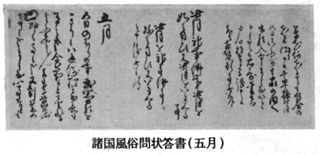 「諸国風俗問状」は阿波へは文化14丑の9月(1817)、江戸公儀御右筆屋代弘賢から藩の儒者たちに届けられ、その地における庶民生活の実態―風俗習慣を尋ねられた。儒者たち(阿波藩は増田哲次=衡亭、立木専蔵ら)はこれを各郡代につたえ、各郡代はさらに郷中の与頭庄屋に触れを出して、その答を求めたものである。