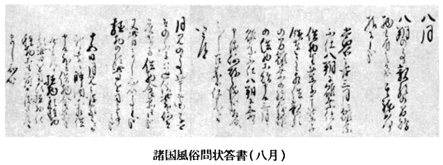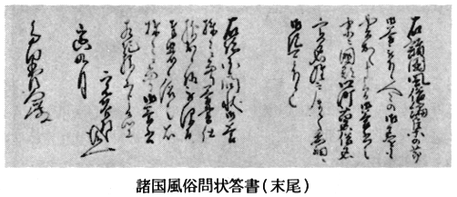 右諸国風俗編集の節御答被下候人々の御名をも書加へ申候間御答書之末に国郡郷町苗名俗名実名姓戸まて委細に御記可被下候也