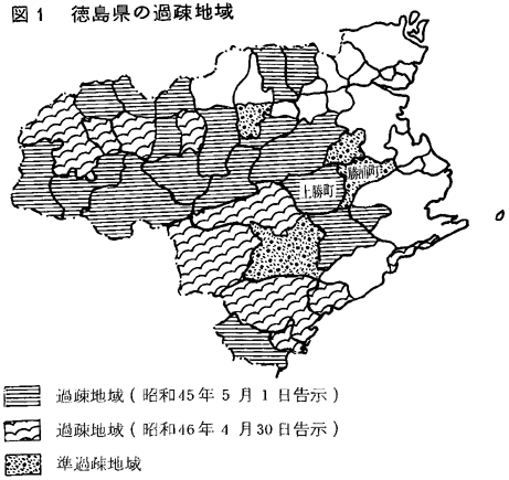 1 はじめに 「過疎」ということばがはじめて公式に登場したのは昭和41年の経済審議会地域部会の「中間報告」である。それ以来現在まで約10年の歳月が経過している。その間昭和45年に成立した「過疎地域対策緊急措置法」以下「過疎法」と略称を中心に、過疎対策が種々論議され、また実施に移されている。 徳島県においても「過疎法」にもとづいて全県50市町村のうち28町村が過疎地域に指定(指定の条件は5年間の人口減少率10%以上で3年間の平均財政力指数0.4未満の町村となっている。)されている。 (図1)
