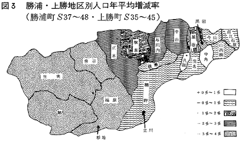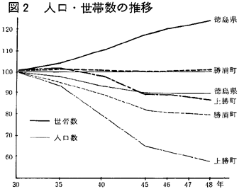 人口についてみると昭和35年から45年まではゆるやかな減少傾向を示しているが、45年以降は横ばいで、昭和48年は前年に比しやや増加している。勝浦町は昭和45年までは徳島県に比べてやや急な下降線を描いているが、それ以降は徳島県同様ほぼ横ばいで人口減少にストップがかかっている。これに対して、上勝町は急激な下降線をたどり、この18年間に2,666人減少し、指数は半数に近い57まで低下している。しかも現在なお人口減少に歯止めがかかっていない状態である。世帯数についても、徳島県の漸増、勝浦町の横ばいに対して上勝町は漸減傾向にあり、挙家離村の一端をのぞかせている。このことから上勝町は今後なお人口減少が続き、過疎化の進展が予測される。 次に勝浦・上勝両町の地区別の人口増減率を示したのが図3である。