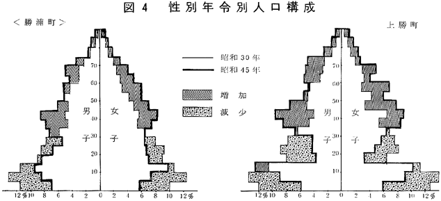 両町とも幼年、若年令層の比率が低下し、中年・老年令層の比率の増大という典型的な過疎地域の特徴を示している。なかでも昭和45年の上勝町の若年令層は13.2%に低下し、全国平均27.7%の半数に満たず、一方老年令層は17.7%に増大し全国平均10.7%を大きく上回っている。また性別年令別人口構成(図4)をみても、昭和30年には両町とも将来人口増加が期待されるいわゆるピラミット型であったが、昭和45年には勝浦町は人口停滞型になり、上勝町は新規学卒者の極端なまでの流出と考えられる15才から20才までの低比率をはじめ極めて不規則な人口構成を示すに至った。