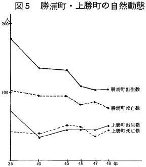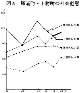 地域社会が維持され発展を続けるためには年令構造のバランスがとれていることが不可欠の条件と考えられるが、上勝町の現在のすがたは年令構成でみるかぎり発展のための条件を欠いているといわざるをえない。 (2)人口の動態からみて 人口の増減は自然増減(出生と死亡)と社会増減(転入と転出)の二つの要素から算出されるが、両町の人の増減をこの二つの要素からみたのが図5・6である。この図から留意すべき二つの事柄が読みとれる。その一つは上勝町が昭和40年・45年・46年において極端にいえば地域社会の死滅を意味する“自然減”になっていることである。もう一つは両町とも“社会減”ではあるが、人口数において勝浦町の半数にも満たない上勝町が転出数では勝浦町とほぼ肩を並べ、人口流出のはげしさを示している点である。