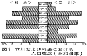 離村先の傾向としては上勝町内にとどまる家は少なく、ほとんどが小松島市、徳島市等の市街地になっている。 棚野立川は勝浦町の南端に位置し、勝浦川の支流、立川谷にそった部落であり、県道より約6km〜11kmの間に11戸が点在している。昭和43年までは、横瀬小学校立川分校があったが、生徒数の減少により本校に統合され、児童は現在、タクシー通学を行なっている。 この立川は、江戸時代、蜂須賀氏の御用林地であり、現在でも約700haの山林を有し、町林業の中心地となっている。また、昭和17年には立川林道が完成し、木材搬出は容易になり、日用品、食料品等の講入も便利になった。しかし、終戦当時には22戸を擁していた。この部落も現在では、その半数が村を離れていき現在11戸50人の小部落になっている。経営耕地面積と同じように零細で、平均0.4aであり自家消費分も充分でない。 一方、山林保有は20ha以上が4戸ある。専業農家は4戸、第一種兼業4戸、第二種兼業3戸となっている。 また、図7の人口構成を見てもわかるように、60才〜70才の年令層の占める割合が最も多く20才代は少ない。生産年令人口は58%と、杉地と同様低い。また勝浦町内に土地を確保したり家を持っている人がかなりおり、長男が離村している傾向は杉地と同様であり、挙家離村はまだまだふえると思われる。離村先としては近隣の勝浦町内が圧倒的に多く、子弟の教育に便宜をはかると同時に林業を続けていくという一石二鳥をねらっているのが杉地と異っている点である。 以上が2つの部落の概要であるが、次にこうした留村農家の人々が過疎化にどう対応しているかをみた。結論から先にいえば、人口流出にこれといった打つ手もなく、将来に不安をいだきながら生活している感じである。 部落のある老人は「水も空気もよいこの土地を離れたくはないが、この部落もやがてはさびれてしまうだろう。2戸や3戸では部落は維持できないし、本当にさびしい。」という老人の言葉がこれを象徴している。部落の人達の願いは、何としても現金収入源と子供の教育である。日用品の買物、医療機関にも以前のように困らないし、娯楽面についても映画は見ないがテレビで結構充足できる。しかしこうした山間部においても、テレビ、冷蔵庫などの電化製品や自家用車の普及など生活水準は都市部とほとんど同じレベルに達している。その生活水準維持のために何よりも安定した現金収入が必要なのである。そして観光開発や工場誘致の促進あるいは小松島、阿南、徳島市などへの通勤を可能にするためにも県道の整備を町・県当局に強く要望している。 さらにもうひとつ強調したいのは精神的なコミュニティの崩壊の危機である。テレビ・電話の普及はますます人々を家庭内にとじこめ月毎にあったお大師講や念仏講等も減少するなど近所づきあいが薄れていく現状に、特に老年層は孤独感を深めている。それをわずかにいやすのは老人会活動で、より活発な活動を望んでいる。