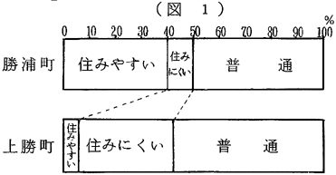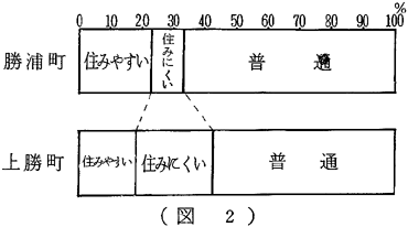 家をつぐとかつがないとかは、男女の差とか、長男次男によってちがってくるが、図1より長男においてさえも、「つぐ予定」と答えた者が勝浦町で45%、上勝町で24%となり、勝浦町よりも上勝町における比率が非常に低く、上勝町で「つがない」が22%と、勝浦町の5%に比較して高い。中学3年生の段階として約半数を占める「わからない」の存在とも合わせて、ここでも上勝町の人口流出を予測させる結果となっている。 問2 現在あなたの町は住みやすいと思いますか。