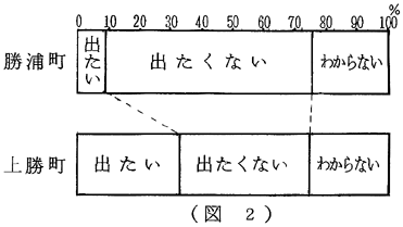 図1からもわかるように、勝浦町においては、「住みやすい」または「普通」と答えたものが約90%で、住みにくいと答えたのが約10%で、現時点では生活にそう不便を感じていないということがうかがえるが、ただ与川内地区で「住みにくい」が33%あり、これは町の平均よりかなり高い。その理由としては、交通、日常の買物の不便さと共に、平地の少なさによる将来の発展への期待が持てないということからではなかろうかと思う。 上勝町においては、「住みやすい」が6%、逆に「住みにくい」が36%もあり、その比率が勝浦町に比べてはるかに高い。 これは交通の不便さ、医療機関の不備による生命への不安、子弟の教育の困難さ、日常の買物の不便さ等が大きな原因であろう。 問2 あなたは事情が許せば町から出たいと思いますか。