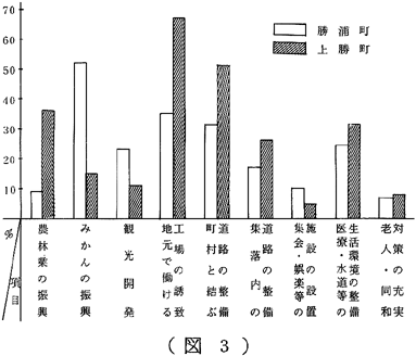 図2からわかるように、勝浦町では、「出たい」が9%、逆に「出たくない」が67%である。 これはまだまだみかん産業に対する将来性への希望、工場誘致による職場の拡張、また通勤する場合でも、自家用車であれば徳島市に40分程度で行く事ができ、生活的にそう不便を感じないというのがその原因と思われる。 上勝町では、「出たい」ものが33%もあるが、これは問1における日常生活の不便さ現金収入の場の少なさ、将来への不安からの結果と思われ、今後の挙家離村による人口流出を暗示している。 問3 あなたの生活をよくするため、町・県・国に何を要望しますか。