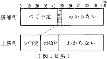 医療・水道などの生活環境の整備等が上位を占めている。 町の過疎化対策としては、町の主産業である農林業の振興、教育文化の向上、観光開発、道路の整備等が挙げられているが、とにかく過疎化の進展の著しい現時点では、町民の期待は安定した現金収入の道を開いてほしいという要求が強く出ている。 以上を通して全般的に言えることは、勝浦町は現時点では生活の場としてはそう不便を感じないということ、県下的に見ても、経済的にはまだまだ豊かであることなどから住民としてどうしても離れたいという強い理由がなく、これが過疎化の急速な進展をくい止めている大きな理由と思われる。しかし、時代のすう盛とは言いながら、若年層の町外流出はかなりはげしく、それに伴なう出生率の低下や出稼者の増大など潜在的な過疎化の進行が推察される。町としては、長期的な展望に立った過疎化対策をすすめる必要があろう。 上勝町は、地理的要因からくる生活環境の悪さとか、将来への見通しの暗さ、現金収入の場が少ないことなどが重なって、これまで培かわれた人間関係をふり切ってでも、町を出たいという意識が強く出ている。 町当局としても、過疎地域振興計画とともに昭和48年に産業振興協議会を結成し、花木、ユコウ、シイタケ、和牛、アメゴ等の振興を具体的な方策を示し、現金収入の道を開こうと積極的に取りくんでいる。 (2)中学生について 中学生の意識調査については、上勝町81名、勝浦町74名の3年生から回答を得た。 問1 あなたはあなたの家をつぐ予定ですか。