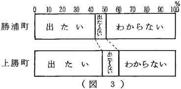 図2より「住みやすい」と答えた者は、勝浦町23%(父兄40%)、上勝町18%(6%)、「住みにくい」と答えた者が勝浦町10%(父兄同じ)、上勝町24%(36%)となり、中学生の意識としては、そう住みにくいという感じは持っていないように思われるが、上勝町の生実、旭地区においては、住みにくいと答えた者がそれぞれ41%、33%と他地域に比較して高くなっている。この両地区共に、上勝町でも一番奥地に属し、生活経験の少ない中学生にもその生活の不便さが感じられるのであろう。 間3 あなたは将来事情が許せば、町から出たいと思いますか。