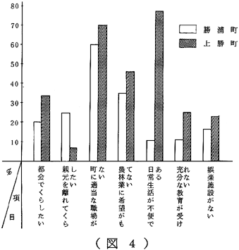 図3より「出たい」と答えた者、勝浦町43%(父兄9%)、上勝町48%(33%)となっている。長男が家をつぐ予定と答えた者の中にも、上勝町では30%の者が出たいと考えている。逆に「出たくない」と答えた者は、勝浦町8%(父兄67%)、上勝町12%(41%)となっている。 「出たい」理由として、図4からわかるように、上勝町では、1