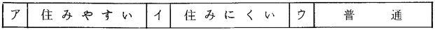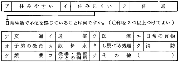 記入にあたって ・それぞれの質問に対し、用意した答のなかから該当するものの記号に○をつけてください。(自分の回答した答から矢印が出ている場合は矢印に従って回答を続けてください) ・その他に○をつけた方は( )内にあてはまるものを書き込んでください。 回答してくださるあなた自身について記入してください。(住所は○でかこむ) 性別(男・女) 年令(満 才) 住所 勝浦町……沼江石原・今山・山西掛・黒岩・中角・星谷・久国 棚野・中山・横瀬・与川内・生名・坂本 上勝町……正木・傍示・福原・生実・旭 問1 現在のあなたの町は住みやすいと思いますか。
