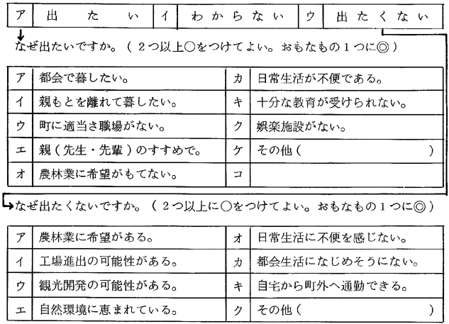 公害のない工場の町 となっている。 全般的に言えることは、中学生の場合、住みやすいとか住みにくいとかの意識は父兄ほど強いものとして出てきていないが、生活を真剣に考える場が少ないせいであろう。 また、町を出たいと答えたものが両町共に40%台であり父兄より多い。これは、自分の進路を決定する場合やはり現在の町内では、充分な生きがいを見出すことが少ないことや、何となく都会にあこがれる気持ちからであろう。 このような郷土に対して、たいした印象ももっていない中学生にどう意識づけていくかが教育の今後の課題と思われる。