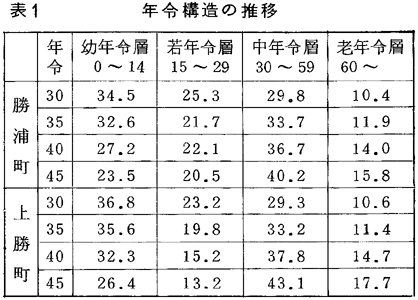 増加地区は勝浦町の久国・中角の2地区のみで、他の地区はすべて減少し特に上勝町は減少率が高い。なおここで注目すべきことは、ここ数年ほぼ人口の横ばい状態の続いている勝浦町内においても、黒岩・与川内・中山各地区や後述する棚野立川部落のようにかなり高い減少率を示していることである。このことは勝浦町内の移動の活発さを示すと同時に、人口減少と過疎化の進展に歯止めがかかったかにみえる勝浦町も人口減少の続く過疎地域をかかえていることを意味している。 b 年令別人口構成 過疎地域における年令別人口構造の特徴は、若年労働力の流出にともなう若年令層の比率の低下と高年令層の比率の増大である。表1は人口を幼年、若年、中年、老年の四つの年令層に区分し、その比率の推移をみたものである。