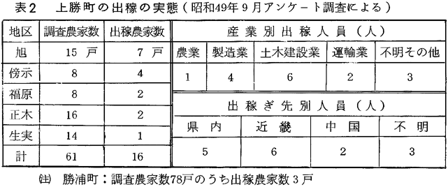 今井幸彦氏は「日本の過疎地帯」で人口動態から過疎を人間の病気にたとえて次のように述べている。「過疎病の第1期症状は村の青年男子が職場と文化生活を求めて都会へ流動し始める。第2期は結婚相手を失った若い女性たちも都会へ流動し、それにつれて親までも離村し挙家離村がぼつぼつ現われる。末期症状の第3期は若い男女は離村し、特に老人が目立ち、自然人口は減となる。自然人口の増減をみることによって病気の軽重がわかる」上勝町の昭和40・45・46年の状態はまさにこの第3期症状に該当する。昭和47・48年が自然増になったとはいえ、他の諸条件をあわせて考えるとき、深刻な過疎の状態にたち到っていると言える。 (3)出稼ぎからみて 山村地域住民の最大の願いは現金収入である。都市部と変らない生活水準を維持し、子弟に高等教育を受けさせるためにはどうしても必要なのである。そして山村住民にとって現金収入の最も手っ取り早い方法は出稼ぎである。しかし、その出稼ぎは家庭を崩壊し、ふるさと意識を薄れさせ、やがては挙家離村を促し、過疎化に拍車をかけることになる。したがって、出稼ぎは過疎化への誘因として、また人口流出の前段階現象としてとらえることができる。 表2は郡内3中学校3年生の父兄に求めたアンケート調査を集計したものである。中学3年生の父兄という限定された対象だけにかならずしも全容を示す数字とはいえないが、その概要をはあくすることができる。