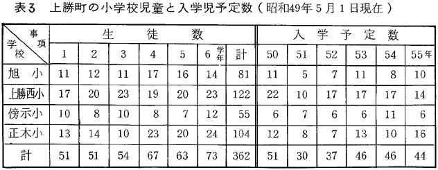 教育問題 一般に老人、医療問題とならんで過疎がもたらす大きな社会問題として教育の問題がある。上勝町でも転出理由の中で「子供の教育」が大きなウエイトを占めている。 過疎地域での教育問題に義務教育と高校教育の二面がある。 前者では、児童・生徒数の減少に伴なう複式学級化による教育環境の悪化である。この対策として上勝町では昭和44年に3複式学級編成となった福原小学校を生実小学校に上勝西小学校に統合した。現在でも傍示小学校が3複式学級編成となっているが、県よりの1名の特配教員と町費による2名の教員を配置して6学級編成としている。なお、2校の中学校とも各3学級となり、教科別の教員が確保できず特例として家庭科・音楽など2校兼務や町費で2名の補充を行なっている。 さらに昭和49年5月1日現在における昭和55年までの小学校入学児童数調査によれば、表3のごとく、昭和51年に旭小、52年には上勝西小を除いて全て複式学級が出現する。