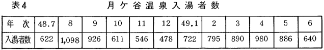 従業員5名で運営しており現在まで黒字経営を続けている。温泉と町内で養殖される美味で姿の美しい溪流の女性アメゴをつかった料理が人気をよび、その利用者数は表4のごとく、夏場を中心に徐々に増加の傾向にある。その7〜8割は阿南・徳島、小松島など町外だが、宿泊者は約2割に過ぎない。しかし、付近には民宿も開設され、観光地らしい景観をみせはじめている。目下宿泊施設の増築工事が進行中である。そのPRもさることながら、入湯だけでなく、地元産の土産品の開発、観光ルートの整備などいま一つ町民への波及効果のための工夫が望まれる。 2