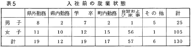 このうち県外・県内他町村勤務者はUターンとみなし、学卒者を勝浦電子がなければ町外に流出したとみなすと46%にあたる60名を地元にとどめたことになる。女子の「自営および家事」56名はほとんど「家事」であるが、農繁期にはみかんの収穫に従事していた人達が多いとみられ、勝浦電子はこれらの人達の農閑期の格好の町内就業先といえよう。