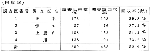 を配布いたしました結果、全世帯の1,033のおよそ2分の1にゆきわたり、その回収も82.9%488枚が得られましたので、この種の調査としては、回収率が良い方ではないかと喜んでおります。上勝町教育委員会、学校、児童生徒、ご父兄のみなさんがたのご協力に対し、厚く御礼申しあげます。調査区の概況を申しあげますと、1
