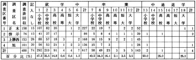 本調査を実施するために、小学校、中学校に在学中の父兄の子弟が、どのように就学しているかを調べたものが第1問ですが、父兄の年齢が比較的若いためか、高校以上の就学中の子弟が少なくなってなっており、卒業・中退とも百分比は表のとおりであります。