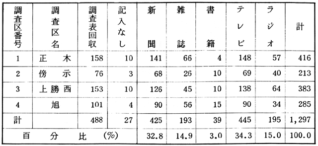 最近、情報化社会は、情報禍社会いわゆる情報の「わざわい」の社会といわれるほど過剰現象を起こしています。ラジオ・テレビ・レコード・テープ・ビデオ・新聞・雑誌・書籍・映画等々、マス・メディアの多様化はおどろくべき数になっております。ある調査によりますと、十年前にくらべて供給量は3.2倍情報消費量は1.4倍にとどまり、情報消費率は30.9%から9.9%にとどまり10分の9はむなしくきえているということであります。情報化社会の受け手である上勝町のかたがたにマスコミといわれる新聞・雑誌・書籍・テレビ・ラジオからどのように情報を受けているか1.2.3.のようにチェックしてもらいましたが、それを合計したものが、つぎのようになっています。
