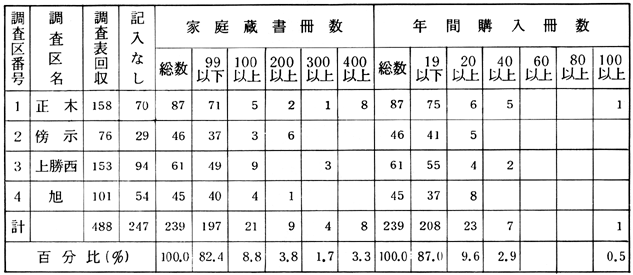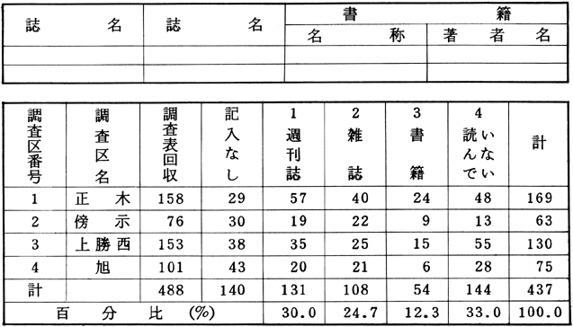 読書に関する世論調査表(昭和49年8月1日現在)を作成し、学校を通じて調査表を配布・回収を行い、読書環境、読書についての背景、読書の状況、などを調べたわけでありますが、13項目にわたる調査設問について順次結果を簡略にご報告いたします。
