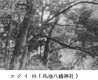 ◎区分種 モミ、ツガ、アカガシ、シキミ・テイショウソウ・ミヤマシキミなど、平均出現種数45種。 この群落は、焼山寺山の頂上を含む尾根から、東ないし北斜面にかけて発達しているもので、高木層にモミ、ツガ、イヌシデ、ケヤキ、トチノキ、アズサ、ミズキ、コハウチワカエデ、ヤマザクラなどの樹高15〜18m、胸高直径60〜80cmの大木が樹冠を形成し、亜高木層にシラキ、カマツカ、ヤブニッケイ、カナクギノキ、アセビ、アオハダ、オンツツジなどがよく出現し、低木層にコガクウツギ、ヒイラギ、ヤブツバキ、アカガシ、クロモジ、ヤマコウバシ、ツリバナ、ソヨゴ、シキミなどがみられ、草本層にテイショウソウ、シシガシラ、マツブサ、ツルリンドウ、コウヤボウキなどが疎に生育している。これらの構成種から、ヤブツバキクラスのアカガシ亜群団のモミ−シキミ群集に属するものと考えられる。なおこの群落には、ヤブツバキクラス域指標種と、ブナクラス域指標種とがほぼ半々に含まれている。 3 コジイ林 かつては広範囲にわたってあったと思われるが、この調査で、阿野字馬地の八幡神社に保存のよいコジイ林が確認された。ここでは、高木層に樹高13〜15m、胸高直径50〜60cmのコジイが優占し、アカガシも混生しており、亜高木層には、コバンモチ(樹高約8m、胸高直径30〜40cm)、タイミンタチバナ、リョウブ、ヤブツバキ、タカノツメ、アラカシ、ネジキ、ヤブニッケイなどがみられ、低木層には、モチツツジ、ネズミモチ、コバノミツバツツジ、アセビ、トキワガキ、カゴノキ、サカキ、カンザブロウノキ、ヤマビワ、マルバウツギ、シロバナウンゼンツツジなど多種類が生育しており、草本層にコジイ、マルバベニシダ、アリドウシ、イズセンリョウ、ナンカイアオイ・ヤブコウジ、コウヤボウキ、コクラン、ササクサ、シャクジョウソウ、リンボク、カナメモチ・コシダ・ウラジロなどがみられる。