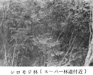 B 代償植生 4 シロモジ林 海抜1000m以上の、かつてブナ林があったと考えられるような場所にみられる代償植生で、場所や地形によって群落組成はやや異なっている。 ◎区分種 ヒメホウチャクソウ、ヤワラシダ、イシズチウスバアザミなど。平均出現種数35.4種。 この群落は雲早山のブナ林の下部などにみられる。ここでは高木層と亜高木層との区別がつかず、樹高8〜12m、胸高直径12〜15cmのシロモジが最優占し、アズサ、コミネカエデ、カナクギノキ、シラキ、コハウチワカエデ、リョウブ、ウリハダカエデ、クマシデ、アワブキ、ヒメシャラ、アオハダ、コハクウンボクなどが可成り密に生育しており、低木層はシロモジ、コガクウツギ、シラキ、クロモジ、ツリバナ、タンナサワフタギ、カマツカ、ツクシシャクナゲ、ヤマボウシ、モミ、ツガ、アセビ、ヤマザクラなどが叢生している。草本層はあまり発達していないがヒメホウチャクソウ、イナカギク、シシガシラ、ナガバノスミレサイシン、フタリシズカ、シコクトリアシショウマ、ミツバテンナンショウなどがみられる。