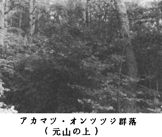 元山から高鉾山への登山道の、海抜600m付近によく発達したアカマツ−オンツツジ群落がみられる。ここでは高木層に樹高12〜15m、胸高直径20〜45cmのアカマツが優占し、亜高木層には、コナラ、ミズキ、ヤマザクラ、リョウブなどが疎に生え、低木層にはオンツツジ、ヤマウルシ、カマツカ、ネジキ、ノリウツギ、ヤマボウシ、イヌツゲ、カナクギノキ、クロモジ、ヒサカキなどが叢生しており、草本層には光が十分達しないため発達悪く特に被度が大きな種はないが、ウマノスズクサ、コウヤボウキ・ヤブコウジ、ヤブレガサ、イナカギク、ヤマジノホトトギス、ツルリンドウ、アキノタムラソウ、エイザンスミレ、アキノキリンソウなど多種類の植物が出現しており、平均出現種数は他の群落にくらべ最も多い。これは、この群落がまだ安定してないことを示している。 b)アカマツ−モチツツジ群集 ◎下位区分種 ナツフジ、ゴンズイ、ネズなど。平均出現種数55.6。 元山の上、海抜約300m付近にみられるアカマツ林では、高木層に樹高10〜12m、胸高直径約15cmのアカマツが優占し、亜高木層にヤマザクラ、ヤマウルシ、コナラ、ゴンズイ、ヤマモモなど、低木層にモチツツジ、カキ、イヌツゲ、ヒイラギ、ヒサカキ、カクミスノキ、コバノミツバツツジ、ウツギなどが叢生し、草本層には、ワラビ、サルトリイバラ、ノブドウ、コウヤボウキ、ヤブコウジ、ナキリスゲ、ヘクソカズラ、ツルリンドウ、ナツフジ、シユンランなど多種類の植物が群落を構成している。 9 アワノミツバツツジ群落 旭丸から高鉾山にかけての稜線部に、アワノミツバツツジを優占種とする群落がみられる。ここでは、アカマツの亜高木を伴うこともあるが、アワノミツバツツジ、シロモジ、リョウブ、ネジキ、アセビ、タンナサワフタギ、ノリウツギ、ヤマツツジなどが密に叢生した低木林である。 10 ススキ草原 雲早山頂から東北へのびる尾根の海抜1380mの所に、少しひらけた鞍部があり、そこに採草によって生じたと思われるススキ草原がみられた。ここは、ブナクラス域に含まれるので、ブナクラス域の指標種であるタンナサワフタギ、ホソバノヤマハハコ、シコクトリアシショウマ、ミヤマワラビ、シロモジなどが、ススキの間に点在しており、ワラビ、ミツバツチグリ、ヨモギなどの草原指標種と混生している。