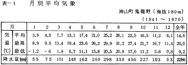 地質学的には、川井峠から寄井を経て佐那河内村符殿に至る御荷鉾構造線によって、町は南と北とに2分されており、南は変成作用の少い古生界(秩父層群)よりなり、北は結晶片岩で強い変成作用を受けた古生界(長瀞系または三波川系)よりなる。そしてこれは破砕帯を伴うため、地辷りが起こりやすい。 2)気候 徳島県の気候を、地域により大きく四つに分けた場合(南部臨海地域、東部臨海地域、吉野川流域地域、四国山地地域)、神山町は、四国山地地域に含まれ、本県としては多雨地域に含まれる。しかし、剣山山地の北側に位置しているため、降水量は県南地方ほど多くはない。鬼籠野における気象条件は次の通りである。 神山町のこれらの地形や気候などの自然環境が、植物の生育や植物群落の発達および分布に重要な要因となっている。