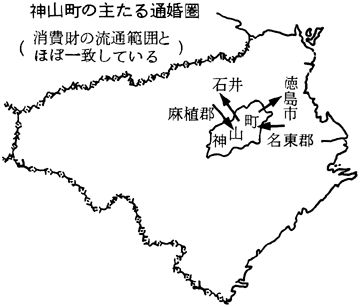 本県の中央部の位置にある神山町とその周辺が、どのような婚姻習俗をもっているかは、阿波の南方と北方の比較において、本県の婚姻習俗を考えるうえで貴重なものであるという視点からこの調査研究を実施した。 1.婚姻について この地方においても、明治・大正ごろまでは、村内婚が殆んどで、ついで、徳島市や石井町方面との通婚が多くみられる。