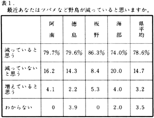 表1、表2からわかるように、海部郡内は野鳥の減り方が他郡市より少なく、またツバメの帰巣率も他郡市より高いことがわかった。このことはとりもなおさず海部郡が自然環境に恵まれている証拠でもある。 最後に牟岐町や徳島県にこの度の調査で強く訴えたいのは牟岐町大島にアオサギが集団生息しておりこれは四国地方でも珍しく何とか保護策を講じてほしい事である。