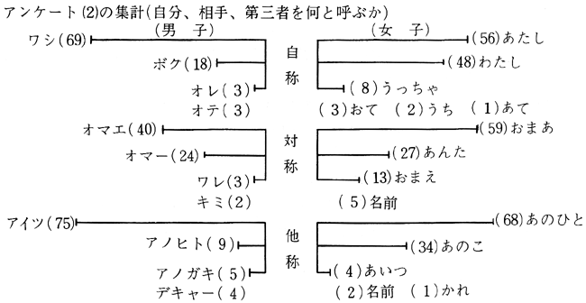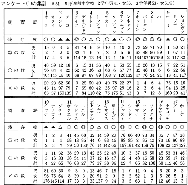 III.方言の変遷 戦後、とくにテレビの普及以後、方言は急速に消滅しつつあると考えられている。果してそれは、どの程度のものであろうか。それを知る一つの手がかりにと思って次の調査を行ってみた。 調査語は昭和9年の「海部郡郷土資料」中の牟岐方言と「牟岐読本」によって選び、対象は牟岐中学校2、3年生191名で、昭和51年9月中に、実施したものである。 アンケート(1)方言について知っていること 次のカタカナの言葉のうち自分がいつも使っているか、または今までに使ったことのある言葉には◎、年寄りなどが使っているのを聞いた言葉は○、聞いたこともない言葉には×印を、それぞれの言葉の次の( )の中に記入して下さい。 1.「自分 のことをオラ( )またはオタイ( )という。 2.「相手」のことをノンシ( )またはアコ( )という。 3.「彼」「あの人」のことをアイツ( )またはデキ( )あるいはレキ( )という 4.「お父さん」のことをトトー( )またはトッツァン( )という。 5.「お母さん」のことをカカー( )またはタッツァン( )という。 6.「兄さん」のことをアンニャン( ) 「姉さん」のことをンネヤン( )という。 7.「おじさん」のことをオッサン( ) 「おばさん」のことをバーヤン( )という。 8.「目」のことをメー( ) 「歯」のことをハー( )という。 9.「海」のことをオミ( ) 「溝」のことをミゾゴ( )という。「正月」をションガツ( )という。 10.「親類」をイッケ( )という。 「手拭」をテノゴイ( )という。 「蛇」をグチナ( )という。 11.「ふざけること」をホタエル( ) 「なぐること」をウドマス( ) 「叫ぶごと」をトエル( )という。 12.「捕えること」をトンマエル( ) 「走ること」をソエル( )という。 13.「汚すこと」をキサガス( )という 「よく働くこと」をヨーイゴク( )という。 14.「ばからしいこと」をタッスイ( ) 「くたびれたこと」をシンドイ( )という。 15.「大きいこと」をザマナ( ) 「小さいこと」をコンマイ( ) 乱暴なことをワヤクナ( )という。 16.「それだから」というのをホヤサカイ( )またはホヤヨッテ( )という。 17.「そうです」というときダー( )という。 「そうですか」というのをホーケ( )という。 アンケート(2)人称について あなたが、気安い人と、普通に話すとき、どんな言い方をしますか)次の1