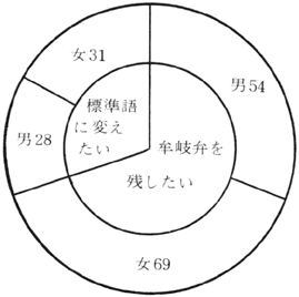 (59名) a.標準語は日本中の人によくわかるから(24) b.標準語は聞いていて感じがよいから(30) c.牟岐弁ではよその人に恥かしいから(10)