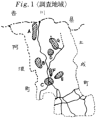 I.調査地域と調査方法 (1)調査地域 山間、谷川の多い旧大俣地区を中心に以下の7地域を選び調査を行った。