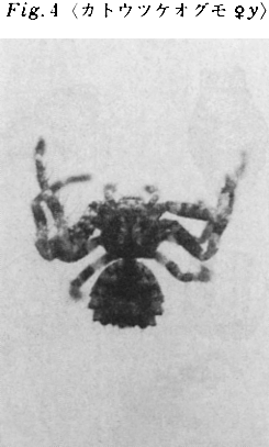 分布:本州・四国 体長、♂♀とも8mmで、背甲・歩脚胸板とも橙黄褐色。腹部の形態眼の配列により、他のアシナガグモと区別できる。 北原の水田に水平円網をはっていたのを採集した。 (4)カトウツケオグモ《1978・9・24 城王山 1♀y》