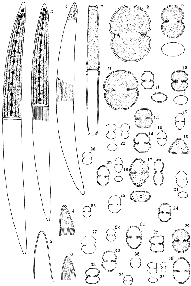 Rich(図II,36,37)日本新 甚だ特異な形態をした種類で、1935年、リッチが西アフリカのローデシヤとトランスバールで発見以来、世界の何処からも見出されていない。ところが、私は終戦直後の頃、徳島市の渋野の池で観察したことがあるので、本県では他地域からも見られると思う。 L