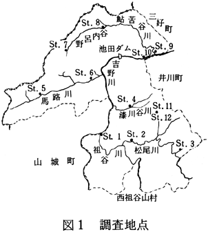 2.調査地点及び調査方法 調査した河川は、池田町を流れるおもな河川である吉野川、馬路川、鮎苦谷川、野呂内谷、祖谷川、松尾川及びその支流、漆川、谷川、そして黒沢湿原にある池と源流性の小さい流れである。これらの水系に、図1に示すように12ケ所の調査地点を置き採集調査した。