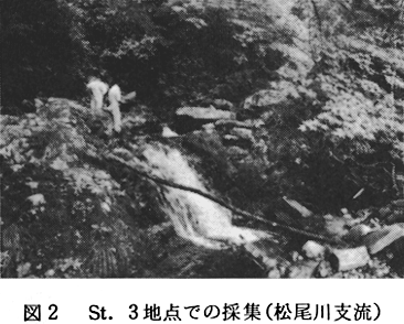 各地点の様相を述べると、St.1は、祖谷口橋の下付近である。ここで、祖谷川は吉野川に合流する。水量もあり早瀬も各所に見られ、石礫底であるが、砂利や砂も多い。St.2は祖谷川の支流である松尾川を出合から約3.5km程上流に行った地点。山間を流れる渓流で清冽な水が流れ、河床も安定に見えた。