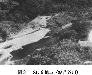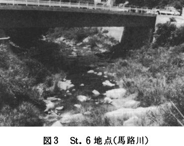 St.3は松尾川の支流の1つである。松尾川の上流部は深い谷となる。谷に流れこむこの支流は、水は清冽であるが、道路工事の土砂が河床を埋め、荒廃がひどい。採集は、人工の加わらない所を選んで行った。St.4は漆川谷川の梅ノ谷付近で、水深は30cm前後で平瀬の多い流れである。底の石礫にはソウ類が多く付着する。St.5は馬路川上流部の船戸付近の小さい流れである。小川に近い様相で水量も少ない。水は濁りが見られる。St.6は馬路川の下流で、この付近にくると水量も増え、各所に白波のたつ早瀬がみられる。